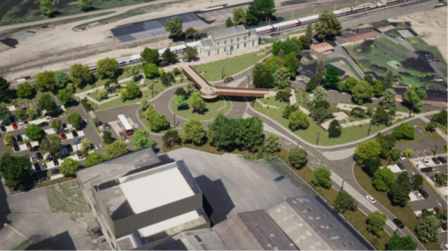 L'opération prévoit des aménagements de parkings, de nombreuses plantations d’arbres et surtout un rond-point avec une passerelle surplombant la route départementale 939 bis.