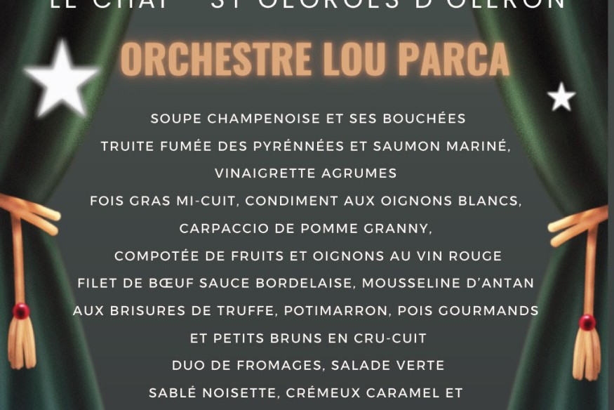 Réveillon de la St-Sylvestre à St-Georges d’Oléron MERCREDI 31 DÉCEMBRE Animé par l’orchestre Lou Parca RÉSERVATION AVEC LE PAIEMENT AVANT LE 17 DÉCEMBRE GINETTE 06 87 18 08 10 OrganisÃ...