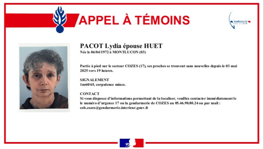 Lydia Pacot, épouse Huet, est partie à pied, ses enfants n’ont plus de nouvelles d’elle depuis samedi dernier, vers 19h. Elle mesure entre 1 mètre 60 et 1 mètre 65 et est de corpulence mince.