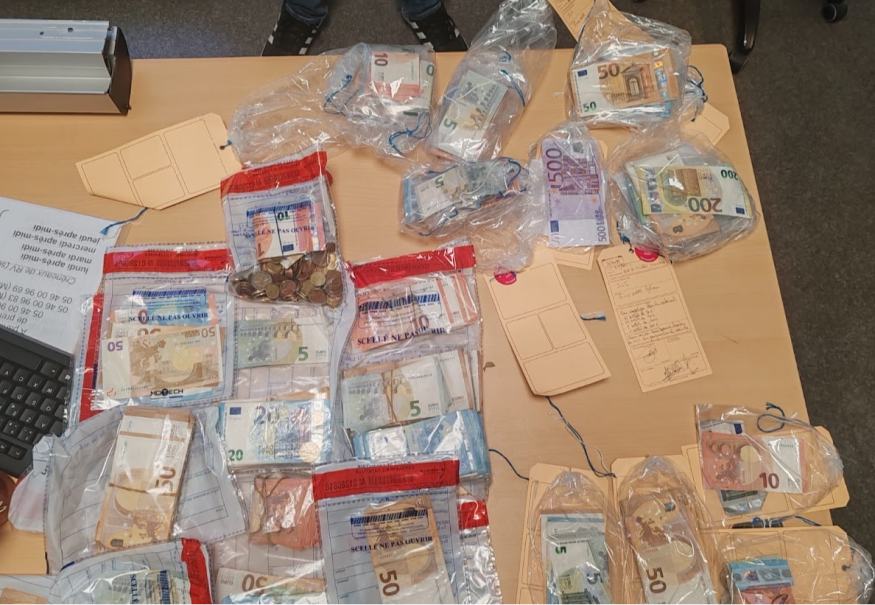 Saisies impressionnantes lors des perquisitions : un kilo de cocaïne, 500 grammes de résine de cannabis et 500 grammes d'héroïne, une cinquantaine de cartouches de cigarettes, un fusil de chasse, et 25.000 euros en argent liquide.