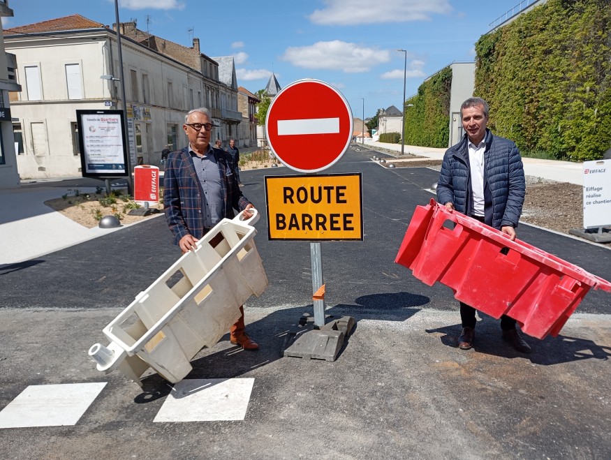 Le maire Hervé Blanché et le vice-président du Conseil Départemental Gérard Pons ont symboliquement retiré les séparateurs de voie ce vendredi 25 avril 2025 à la mi-journée. La fin d’un chantier interminable, puisqu’il s’est étalé sur 14 mois, il a pris beaucoup de retard en raison de fouilles archéologiques, et la découverte de sépultures du 12ème siècle.